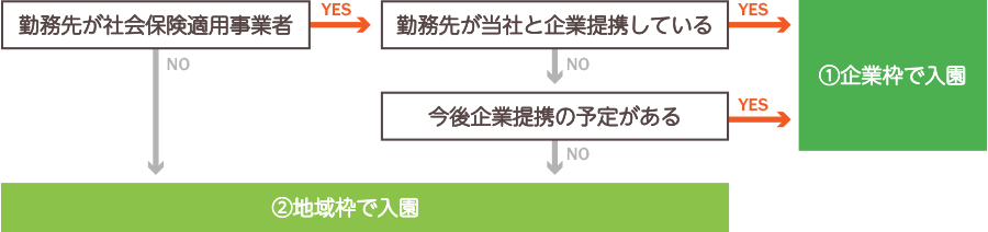 ①企業枠で入園...お勤め先が、社会保険適用事業者かつ当社と企業提携している(または提携予定)